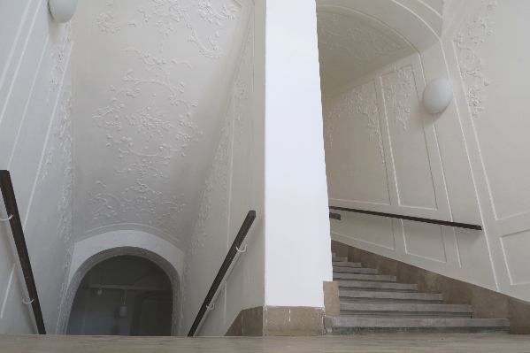A látogatók által is használható lépcsőházat teljes hosszában virágdíszes stukkó borítja.