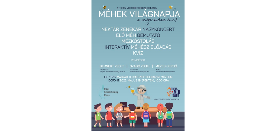 A Magyar Természettudományi Múzeum és a Tehetsz méh többet! kampány 2023. május 19-én, pénteken rendezi meg a Méhek Világnapját. Ezen a napon méhekről és más beporzókról szóló ismeretterjesztő programokkal, koncerttel, meseolvasással, mézkóstolással várják az érdeklődőket a szervezők.