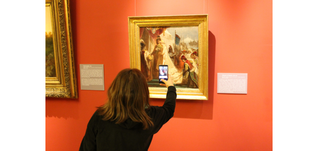 Egy külföldi hallgató Benczúr-festményt fényképez. Móra Ferenc Múzeum, 2018. Fotó: Hegedűs Anita