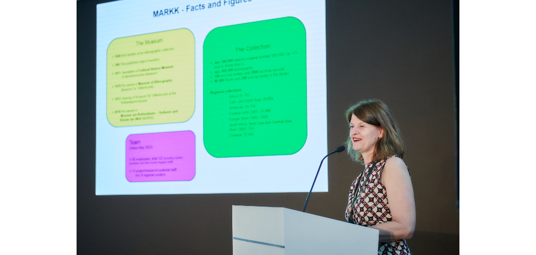 Barbara Plankensteiner, a hamburgi Museum am Rothenbaum igazgatója Mozgásban a MARKK – Egy hamburgi néprajzi múzeum újrapozícionálásának sikerei és kihívásai címmel tartotta meg előadását. A hamburgi antropológiai múzeum útkeresését a dekolonizációs törekvések határozták meg. A 2017 előtti kiállítási gyakorlatukra még jellemző volt a kultúrák rekonstruálása, illetve a látogatók körében nagyobb népszerűségnek örvendtek a különböző, hagyományos folklórral és kultúrával kapcsolatos események, fesztiválok és vásárok, mint a kiállítások. A múzeumi megújulás egyik legfontosabb iránya a korábbi gyakorlatukkal szemben a sztereotípiák lebontása, megkérdőjelezése lett. Egyrészt ezt mutatja az intézmény nevében a völkerkunde (etnológia) kifejezés lecserélése egy olyan névre és arculatra, ami utal az önreflexióra és a különböző csoportok felé való nyitottságra. Előadása bemutatott az intézmény újrapozicionálásának részeként eddig megvalósított projektet, kezdeményezést: a kiállítások tartalmi megújítását, új közösségi tér létesítését, afrikai forrásközösségekkel való együttműködéseket, különböző csoportok bevonásával készült projekteket, kiállításokat. Előadásában kiemelte azt a kihívást, hogy az intézménynek egyre több különböző elvárással kell szembenézniük: egyrészt abban, hogy inkluzív módon reflektáljanak a társadalmi problémákra illetve a gyűjteményüket is elérhetővé tegyék különböző kollaborációkban, együttműködésekben és kutatásokban.