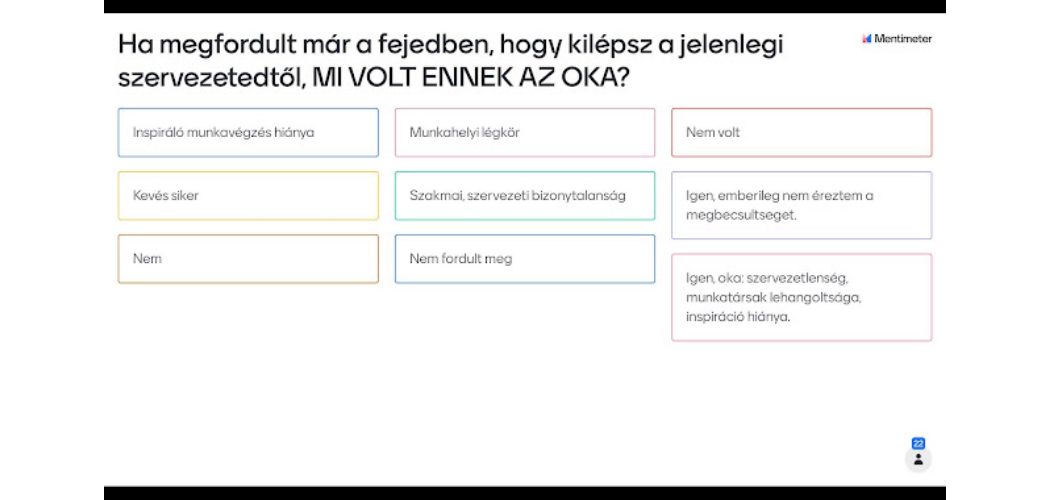 A pályaelhagyás témájának körüljárását azzal kezdtem az előadásban, hogy megkérdeztem a hallgatóságot, hogy vajon ők hogy állnak a pályaelhagyással, megfordult-e már a fejükben, hogy kilépnek és ha igen, miért? Többek között az alábbi válaszok születtek.