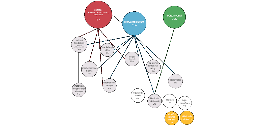 A Múzeumi Kilépő válaszadói legnagyobb arányban, 43%-ban olyan okokat soroltak fel, amelyeket a vezető viselkedése, stílusa, tudása, elképzelései kategóriába soroltunk annak tudatában, hogy például a szakmai kibontakozás, a prioritások felállítása, a megbecsültség mind nagyrészt múlik a vezetőn.