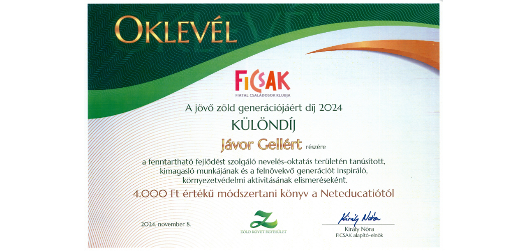 Mint látjuk, múzeumpedagógusként is számtalan lehetőségünk van arra, hogy a környezetvédelem és a környezeti nevelés terén hatékonyan cselekedjünk, s ez természetesen még tovább bővíthető is. Ebben nincsen végső cél, sőt a legtöbbször kézzelfogható, azonnali, látható eredmény sincs, de lehet, hogy az a diák az új ismeretek vagy a látott példa alapján hazamegy és ráveszi a szüleit, hogy másnaptól környezettudatosabban, fenntarthatóbban éljenek, s akkor már megvan a „haszna” is a munkánknak. Mindezt nem több pénzért és nem is díjakért tesszük, mégis jól esik az elismerés, ezért is örültem, hogy nyertem, nyertünk a Fiatal Családosok Klubja és a Zöld Követ Egyesület szakmai támogatásával megvalósult „A jövő zöld generációjáért díj 2024” című pályázaton, mert az ilyenek további motivációt adnak ahhoz, hogy folytatni érdemes munkánknak ezt a részét is.