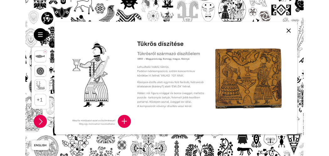 Az angol és magyar nyelven elérhető alkalmazáson fekete-fehér motívumábrázolások jelennek meg szétszórva a képernyőn. Ezekre rákattinthat a nézelődő, ekkor megjelenik az ábra a motívum eredeti hordozójaként funkcionáló tárgyról, melyről egy rövid leírás is olvasható. A minták és díszítmények tengeréből a tetsző motívumok kiválaszthatók ilyen módon. Az erre a feladatra szolgáló gombbal kiválasztott motívumok – egyszerre négyet lehet kiválasztani – ezt követően megjelennek a fehér üres térben különböző matematikai, geometriai alakzatokba rendeződve, azokban körkörösen vagy a kaleidoszkóp működésére emlékeztetve mozogva. Ezeket a látogató mozgathatja az érintőképernyőnek köszönhetően. Amikor ezek a mozgatás során a tetsző állapotban rajzolódnak ki, akkor a programot használó személy elmentheti azt QR kód segítségével.