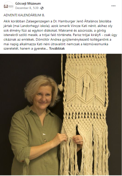 A Göcseji Múzeum munkatársai december hónap minden napján kinyitnak egy képzeletbeli ablakot a múzeum facebook oldalán és megosztanak egy műtárgyat valamint a múzeum blogján a hozzájuk kapcsolódó történeteket.