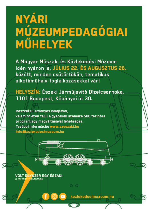 A múzeumpedagógusok augusztus 26-ig egy csütörtöki alkotóműhelyre invitálják 14-16 óra között a járműkedvelő közönséget, ahol a résztvevők játékos és kreatív formában gondolhatják át az Északi Járműjavító múltját, jelenét és jövőjét.