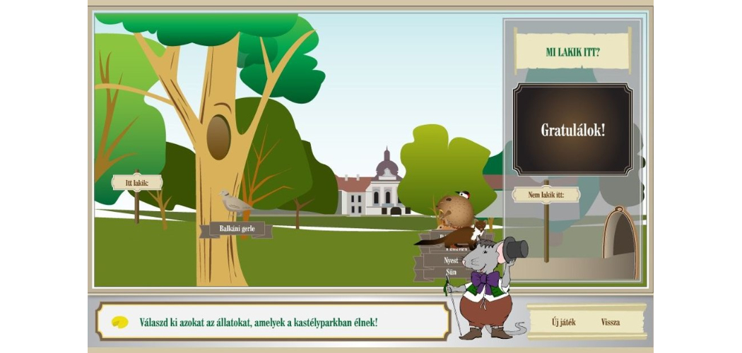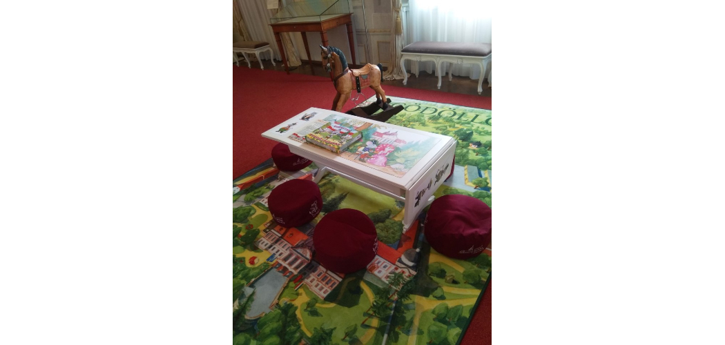 Mindeközben tovább építettük a meséhez kapcsolódó múzeumpedagógiai programot. A kastély előtt kihelyezett, négynyelvű ismertető tábláinkat kiegészítettük egy ötödikkel, egy rövid, gyerekeknek szóló, meseképes kastélytörténettel. Az állandó kiállításba pedig interaktív foglalkoztató pontokat terveztünk: mégpedig olyan „egérlyukakat”, amibe belekukucskálva az ingyenes játéklap egy-egy kérdésére lehet választ találni. Mária Valéria főhercegnő egykori lakosztályában játszósarkot alakítottunk ki, saját meseszőnyeggel, hintalóval, építőkockákkal, mesekönyvekkel.