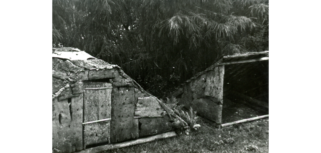 Installáció a múzeum udvarán az erdő néprajza témához: fakéregből készült erdei kalyibák