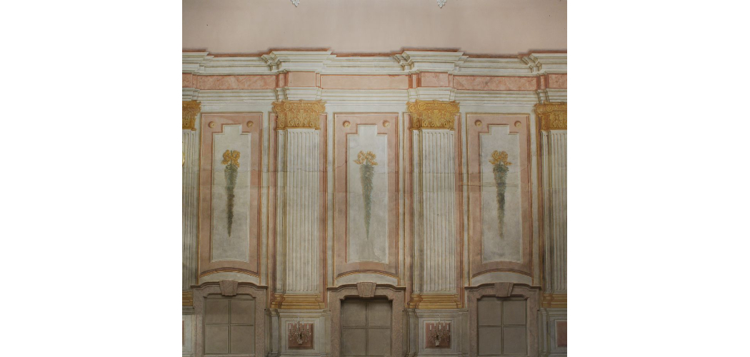 A színházterem falait klasszicizáló késő-barokk festés díszítette. A római oszlopfős, térhatású félpilléreket felül párkányzat, alul márványhatású lábazat köti össze. A pillérek közötti felületeket okker keretezésű, rózsaszín mezők töltik ki, szalagcsokros növényfüzérekkel. A nézőtér felé enyhén lejtő, 80 négyzetméteres színpadot a kor színvonalán álló technikával működtették. A barokk színpadkép térhatását oldalról betolható kulisszákkal, felülről függesztett díszletvásznakkal (ún. szuffitákkal) és hátsó díszletvásznakkal érték el.