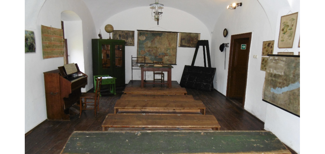 Az iskolatörténeti tárlatunk két szekciója az osztályterem és a tanszer- taneszköztörténeti kiállítás. Az osztályterem a 20. század elejének elemi népiskolai hangulatát tolmácsolja. Mindjárt a bejárati ajtó melletti fogason ott függ a kántortanító kalapja és sétapálcája. A katedrán ott az osztálykönyv, a tapper, a kalamáris és az elmaradhatatlan mogyorópálca. A napkezdő közös imádságok zeneszerszáma a harmónium, Petőfi Sándor „Füstbe ment terv” című megzenésített versének kottájával, felette a falon Himnusz szintén kottázott papírtáblája. A berendezést alkotó fából ácsolt korabeli padok és vaskályha mellett körös-körül szemléltető ábrák a természettudományok és a történelem területeiről, köztük szorzótábla, mennyiségtani oktatókép, magyar történelmi eseményeket megjelenítő színes olajnyomatok Hunyadi János hősi harcaitól, Zrínyi Ilona küzdelmein keresztül, egészen 1848/49 felemelő pillanatainak megidézéséig. Külön figyelmet érdemel a katedra mögötti falon látható 1893-as Európa térkép, amely Kogutowicz Manó munkája, a terem keleti oldalfalán pedig id. Lóczy Lajos geográfus 1902-es Balaton térképét szemlélhetjük. A két üvegezett iskolai szekrényben korabeli tankönyveket, palatáblákat, tintatartókat és gyermekjátékokat találunk, utóbbiak között a csutkababát, rongylabdát, üveggolyókat, csúzlit, bugylibicskát, bilickét, búgattyút és a kukoricahegedűt.