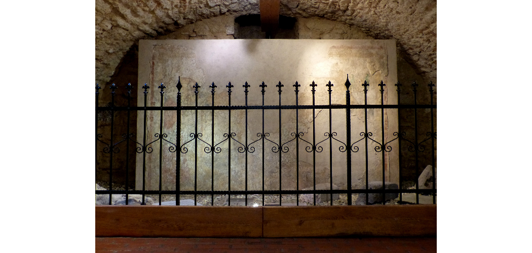 A tapolcai templom külső falait a 15. századtól színes, gótikus stílusú freskók ékesítették. A külső déli falon ma is kivehető Szent Kristóf és a vállán ülő gyermek Jézus nagy méretű de töredékes alakja. A szentély külső keleti falán pedig a Jézus születése című bibliai jelenet töredéke volt látható 1979/80-ig. A freskót ekkor leválasztották a falról, konzerválás és részleges rekonstruálás után pedig ma a lapidáriumi tárlatrész leghangsúlyosabb látnivalójául szolgál.