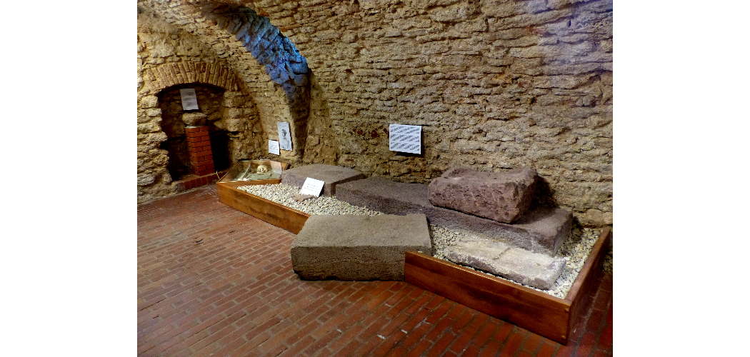 A mai Templom-dombi épületek (múzeum, r. k. általános iskola) a késő középkori/török kori tapolcai vár helyén állnak, s részben annak köveiből is épültek. A régészeti ásatások egyes szezonjaiban a vár faragott kőemlékei ugyancsak előkerültek. Az erődítmény első építési periódusának egyszerűsített makettje, mintegy térbeli tömegvázlatként szemlélteti a vár egykori tömegalakításának jellegét: a téglalap alaprajzot és a hengeres saroktornyokat. A kapcsolódó kőemlékek többsége hajdani nyíláskeretekhez tartozó töredék. A leglátványosabb kőfaragvány egy malomkőre emlékeztet, ám teljesen más célt szolgált hajdanán. A vörös homokkőből készült, méteres átmérőjű, épségben megtalált lelet a tapolcai vár 17. századi kialakítású felvonóhidas-farkasvermes kapuvédő rendszerének 1985-ben megtalált ellensúlyaknájának az aljáról került napfényre. Eredeti funkciója szerint a felvonóhíd leeresztésének és felhúzásának könnyítését szolgálta, az ugyanekkor, de törött állapotban megtalált másik ellensúlykővel egyetemben.
