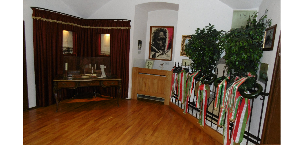 Batsányi János költő, nyelvújító, tudós, a magyar felvilágosodás korának egyik kiemelt szereplője Tapolcán született 1763. május 9-én. Tapolcai, keszthelyi, veszprémi, soproni és pesti tanulmányi éveit követően főnemesi családi nevelőként, majd lapszerkesztőként működött, mint a kassai Magyar Museum alapító-szerkesztője és cikkírója. Tapolcai múzeumtörténeti szempontból hangsúlyos tény, hogy Batsányi 1769/70 táján az akkor még a mai múzeumépületben működő iskolában kezdte alsófokú tanulmányait, amelyre 2006 óta márványtábla is emlékeztet az intézmény boltíves tornácának falán. Batsányi későbbi pályafutása során a francia forradalom és a forradalmi eszmék híveként két alkalommal is bíróság elé került és vizsgálati fogságot, illetve börtönbüntetést szenvedett. Bonaparte Napóleonnak a magyar nemességhez címzett 1809. évi kiáltványa magyarra fordítási munkálataiban ő is részt vett. Az emlékkiállításunkban a képi és tárgyi rekvizítumok mellett két enteriőr idézi meg a költő korát. A dolgozószoba íróasztalán írásai és levelei nemesmásolatai mellett bonapartista attributumok, Napóleon 1809 schönbrunni kiáltványának másolata láthatók. Ámor és Psziché porcelánszobra pedig feleségével, Baumberg Gabriella bécsi költőnővel közös életútját szimbolizálja. A másik enteriőr a linzi Duna-parti temető azon szegletét jeleníti meg, ahol a Napóleon melletti cselekményei miatt börtönre, majd élethossziglani száműzetésre ítélt költő nyugodott 1845 és 1934 között, amikor is nejével együtt exhumálták, majd Tapolcára hozták őket. A kiállítási enteriőrben az eredeti síremléküket látjuk, amelyet még életében maga Batsányi készíttetett. 1934-ben a sírkövet is elhozták és 1995-ig ez állt a tapolcai Régi temetőben kialakított díszsírhelyen. A lassú állagromlása miatt azonban egy méret- és formahű márványmásolat készült róla, amellyel kiváltották az eredet példányt, amely így jutott a múzeum birtokába.