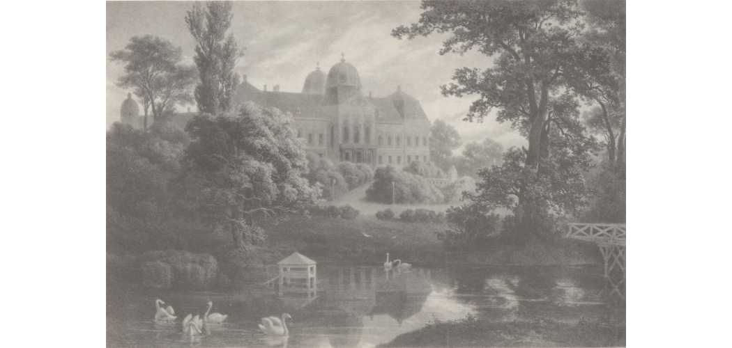 A gödöllői kastély a hattyús tóval Keleti Gusztáv Gödöllő című metszetén. (A Gödöllői Királyi Kastély gyűjteményéből)