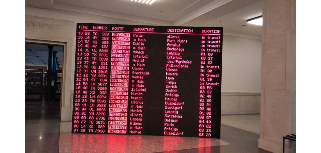 Ugyancsak a mobilitás témakörével foglalkozik a Bécsben élő médiaművész, Ulrich Formann 2022-ben készített installációja. A mű első látásra egy normál repülőtéri kijelzőtáblához hasonlít. A salzburgi Museum der Moderne kölcsönzése jóvoltából az alkotást most a chemnitzi Technische Universität könyvtárának aulájában lehet megtekinteni. A mű az európai repterek aktuális forgalmi adatait kéri le, és ezeket összeveti a tracking-oldalak radarinformációival, ahol minden ténylegesen közlekedő gép szerepel.