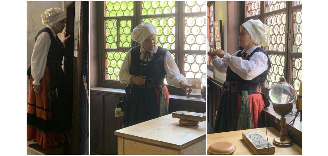 A múzeumban a modern kor vívmányai is megjelennek, de nem zavaró a jelenlétük, ugyanis ezek az interaktív felületek valahogy belesimulnak az enteriőrbe, és nagyban segítik a megértést. Izgatottan lapoztuk azokat a monitorokat, amelyeken bemutatták, kik voltak Dürer kortársai Itáliában, Németalföldön és francia földön, egy másik monitoron megismerhettük a házaspár középkori szomszédjait, egy harmadikon azokat a használati tárgyakat, amelyekről ma már nem is hallunk. A ház megálmodói ügyesen adnak át ismereteket a meghökkentés módszerével, például feltette a kérdést az okoseszköz, vajon mit keres a Mona Lisa a Dürer-házban? Talán azt, hogy amíg Leonardo da Vinci az egyik leghíresebb művét 1503-ban megfestette, addig Európa másik részén Dürer is megalkotta 1504-ben a leghíresebb rézmetszetét, az Ádám és Évát. De a házban alkalmanként bemutatókat is tartanak és workshopokat is szerveznek, ahol a legügyesebbek kipróbálhatják a rézmetszetkészítés minden csínját-bínját.