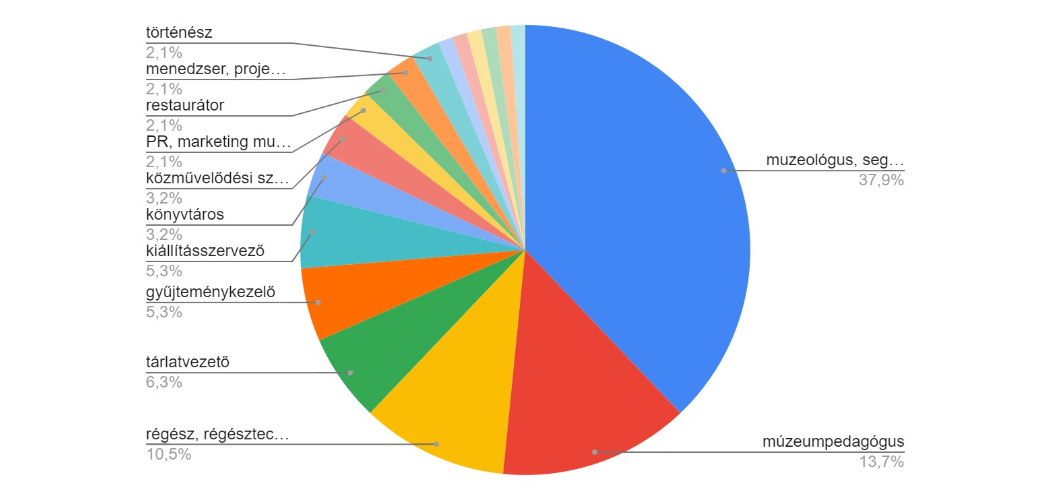 A válaszadók zöme 3-5 éve dolgozik múzeumi területen, de találtunk olyan kollégát is, aki huszonhét éves szakmai múlttal is fiatalnak vallja magát. A kérdőívet kitöltők bő egyharmada muzeológusként, segédmuzeológusként dolgozik, de jelentős a múzeumpedagógusok, régészek, tárlatvezetők, gyűjteménykezelők és kiállításszervezők aránya is.