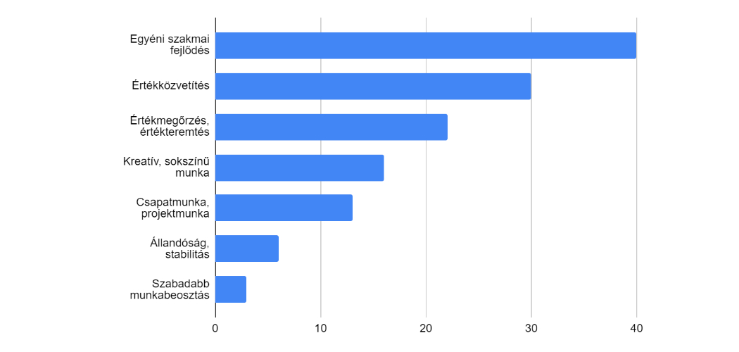 A következő pontban a fiatal múzeumi dolgozók értékpreferenciáit kívántuk felmérni, illetve megtudni, hogy mik azok a tényezők, amelyek leginkább a pályán tartják őket, amit a legfontosabbnak, legmotiválóbbnak tartanak munkájukban. Bár a közalkalmazotti státusz kapcsán leginkább a stabilitást, állandóságot szokás emlegetni – ahogy az előző kérdésben a válaszadók nagy része is a biztonságot félti a változások kapcsán – azt látjuk, hogy a fiatalok értékrendjében ezek a szempontok nem a legfontosabbak, a biztonság csak a válaszadók 5%-a számára elsődleges, amit a legtöbben kiemelnek az az egyéni szakmai fejlődés lehetősége (31%) melyet olyan sajátosan “közszolgálati” szempontok követnek mint az értékközvetítés (23%) és értékteremtés (17%). Egyik válaszadó szerint: “az, hogy a kis településen, melyet a múzeum szolgál, az egész közösség életére pozitív hatást gyakorló tevékenységet tudok folytatni – úgy, hogy nem külső nyomásra, hanem szakmai elhivatottságból dolgozhatok.” Tizenhat válaszadó sorolja első helyre a múzeumi munka sokszínűségét, kreativitását, egyikük így fogalmaz: “kultúrában dolgozni alapvetően kihívás, és emellett érdekes, kreatív tevékenységet feltételez, amely során talán sikerül elhinnem, hogy valami hasznosat és értékeset csinálok, ami nem a versenyszerű fogyasztásról és vásárlásról szól.” A csapatmunka, a munkaközösségben megszerezhető tudás is sokakat motivál, “kreatív kollégákkal együtt gondolkodni”, “napi szinten szakemberekkel találkozni” olyan minőségi szakmai közegként határozza meg múzeumot, ahol a képességek összeadódnak és ösztönzően hatnak, miközben biztosítják a képzett és tapasztalt utánpótlás kinevelését is.