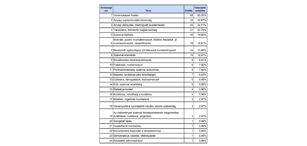 Fontos kiemelni azt is, hogy az anyagi megbecsültség mellett a szakmai fejlődés lehetőségeinek biztosítása is mindenképpen a prioritások között szerepel. A fiatal múzeumi dolgozók igényt tartanak a folyamatos tanulásra és készségfejlesztésre (20 említés) akár intézményen belül, akár külső képzési lehetőségek, tapasztalatcserék révén (7 válaszadó számára ez a legfontosabb szempont). Egyikük szerint: “folyamatos szakmai továbbképzésre lenne szükség (nem csak MOKK keretein belül) – tágítva az adott munkakör, terület tudását, ismereteit, és nem csak azért, hogy egy személy másik 3 ember munkáját is képes legyen elvégezni! Inkább egyszerűen arról lehetne szó, hogy szuper, képzett, lelkes, innovatív, folyamatosan fejlődő személyek dolgoznának adott munkakörben, amelynek köszönhetően lelkesebbek, hatékonyabbak és még izgalmasabb produktumok (program, kiadvány, kiállítás stb.) születhetnek ezek által.”