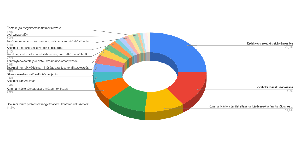 Végül arra kérdeztünk rá, hogy mit várnak a fiatal múzeumi dolgozók a szakmai szervezetektől, milyen konkrét feladatokat kellene ezeknek a szervezeteknek ellátniuk, ahhoz, hogy ténylegesen segítsék a fiatalok szakmai fejlődését. Erre a kérdésre 85 válasz érkezett, néhányan nem tudtak javaslatot megfogalmazni, úgy gondolták, hogy a szakmai szervezetek már most minden tőlük telhetőt megtesznek, vagy épp ellenkezőleg, képtelenek bármilyen érdemi változást elérni. Szintén némileg megjósolható módon, az első helyre az érdekképviselet, a szakmai érdekérvényesítés került, ami kétségtelenül a szakmai szervezetek fontos feladata is lehet, de döntően mégis felmerül az intézményi és ágazati szakszervezetek szerepe – vagy éppen ezek súlytalansága. Második helyen szerepel a továbbképzések szervezése, mely részben a múzeumi szakterület felsőoktatási alulreprezentáltságát is aláhúzza. Ahogy a negyedik helyen szereplő szakmai fórum igénye is mutatja, a fiatalok első sorban olyan képzésekre vágynak, amelyek nem a diszciplináris keretek között is jól elsajátítható szűk szakterületeket fedik le, hanem olyan általános múzeumi gyakorlatokról, eljárásokról, dilemmákról nyújtanak tájékoztatást vagy készségfejlesztést, amelyek minden múzeumi intézmény számára megkerülhetetlenek. “Jó lenne egy közös platform, ahol a múzeumokat egyaránt érintő kérdések (állagvédelem, közönségkapcsolatok, digitális arculat, stb.) megvitathatók, illetve ha lehetne e témákban közös kurzusokon részt venni a jövőben is, az nagyon hasznos lenne. A Pulszky Társaság eddig is működött ezen a területen, ezért nem hiszem, hogy újdonságot írok, inkább csak megerősítést.” Műhelyviták, konzultációk, workshopok, konferenciák lehetnek a legfőbb eszközei a “kortárs problémák megvitatásának, a szakmai diskurzus erősítésének.”