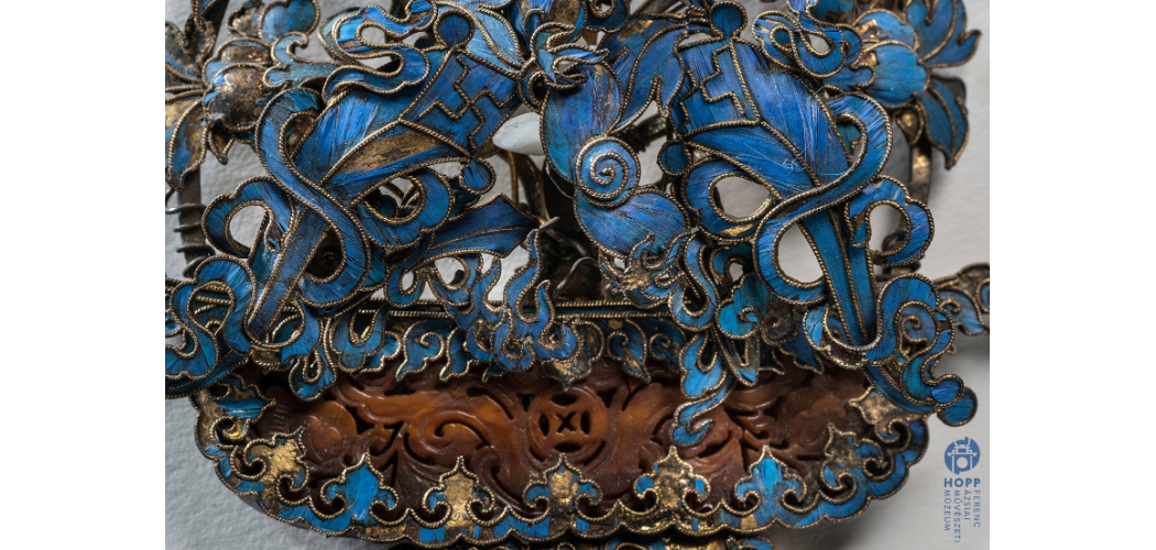 Leírás: HAJDÍSZ (részlet), Jégmadártoll-berakás, aranyozott ezüst, jáde