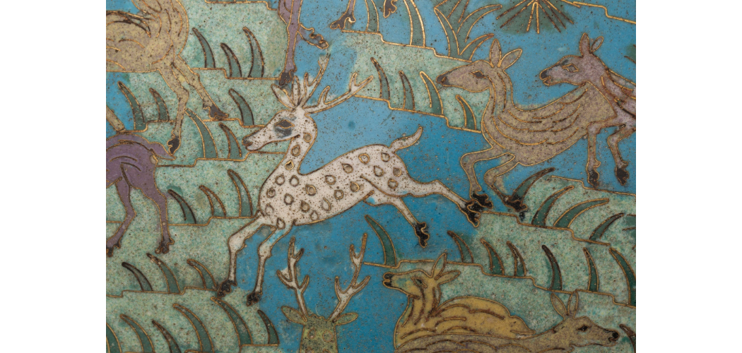 Leírás: Három darumadáron álló fedeles füstölő pöttyös szarvasokkal díszítve, rekeszzománc, Kína, 18. század közepe