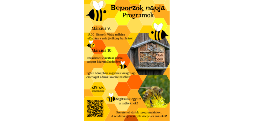 A világszerte rohamosan fogyatkozó beporzó rovarok számára építünk kényelmes lakot. A városban egyre kevesebb a dúsan burjánzó, vadnövényekkel benőtt terület, ahol élelemre és búvóhelyre találnak láthatatlan segítőtársaink, akik nélkül nemcsak méz, de gyümölcs sem kerülne az asztalunkra. A méhek, darazsak, katicák áttelelésre vagy kicsinyeik felnevelésére alkalmas "házikó" természetes anyagok (toboz, nád, bambusz, szalma, kéreg, fahasáb) használásával készül és egy lakótelepi erkélyen, vagy az ablakpárkányon is elfér. 2018-ban március 10-ét választották a Beporzók napjának. Készüljünk együtt: gyertek, és barkácsoljatok velünk!