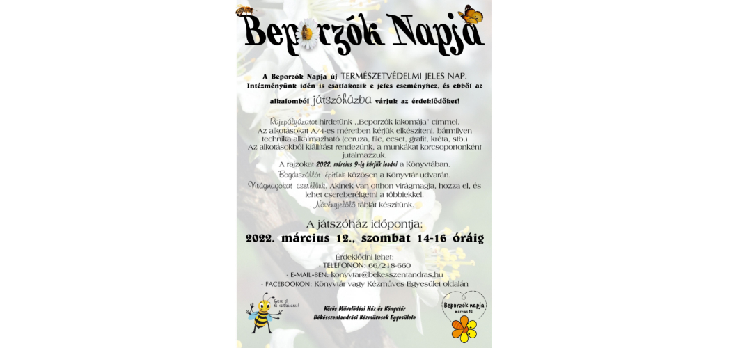 Rajzpályázatot hirdetünk, ˇBeporzók lakomájaˇ címmel. Az alkotásokat A/4 -es méretben kérjük elkészíteni bármilyen technika alkalmazható. Az alkotásokból kiállítást rendezünk, a munkákat korcsoportonként jutalmazzuk.
