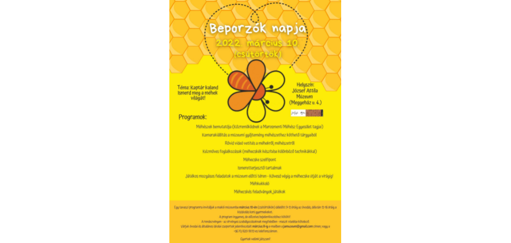 A József Attila Múzeum várja az óvodás- és általános iskolás csoportok jelentkezését az ingyenes programra! A múzeum különböző tereiben méhészek tartanak bemutatókat, ismertetik a használati eszközöket, az időszaki