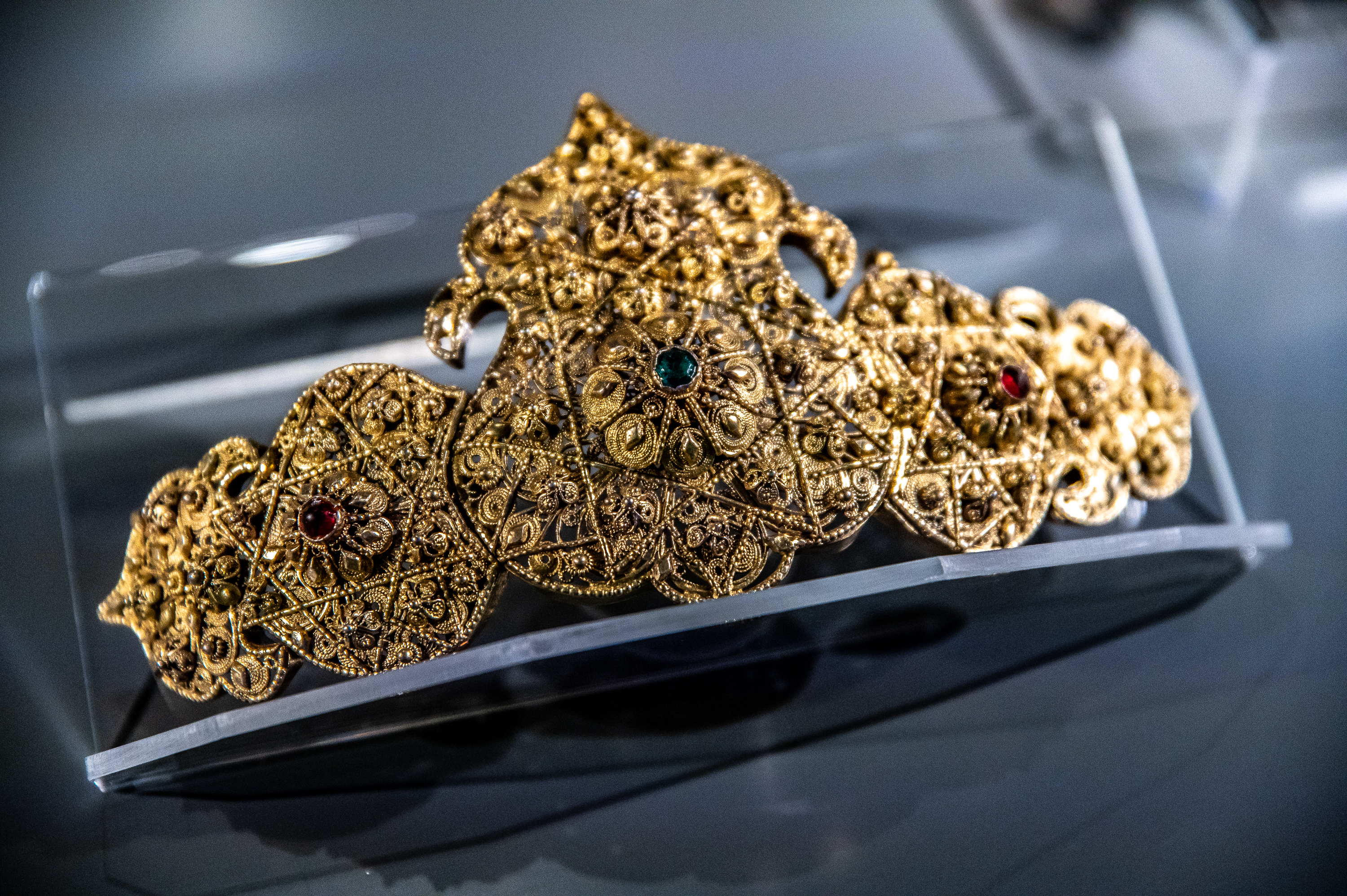 Egy ilyen grandiózus vállalás esetén nem szégyen a számokkal büszkélkedni: az előkészületek alatt 503 műtárgyat tisztítottak meg a restaurátorok, a kiállítás 44 lelőhely anyagát mutatja be, és 27 kortárs ékszer csodálható meg a 6 téma köré szerveződött válogatásban, mely egyértelműen lehetne a legek tárlata is. A legrégebbi ékszerek a 40 000 éves mamutagyarból és csontból készült függők, a legfiatalabb pedig egy 2021-ben készült ékszer. A legértékesebb ékszerek a kölkedi kincsek, a legkényelmetlenebbek pedig azok a bokaperecek, melyek a keltáktól maradtak ránk, és Kosdon kerültek elő 1951-ben. A legkülönlegesebb ékszer a szerető szeme nevet viseli: egy hajból font lánc csatján a szeretett hölgy egyik szeme ragyog. A legmeghökkentőbb ékszer egy patkószegből készült gyűrű, a legérdekesebb pedig egy székesfehérvári karkötő, mely a bazilika egyik 12. századi, feltehetőleg királynői sírjából származott, ám többi részétől elszakítva, karkötővé alakították át a 19. század közepén. A legbizarrabb ékszerek minden bizonnyal a hajból készült díszek, a legnagyobb ékszer a majdnem fél kilós gyermely-szomori fibulapár, a legkisebb pedig egy balta alakú szarmata csüngő. Az iménti szakmai rangsorolás Hegedűs Zsuzsa, Dr. Kiss Erika és Dr. Pető Zsuzsa kurátorok kedvcsináló apróbetűs kiállításkísérője is lehetne, vezetve minket a sárga úton, Csodaország kincsei között, a Kárpát-medence tárgyi örökségének ragyogó történetében.