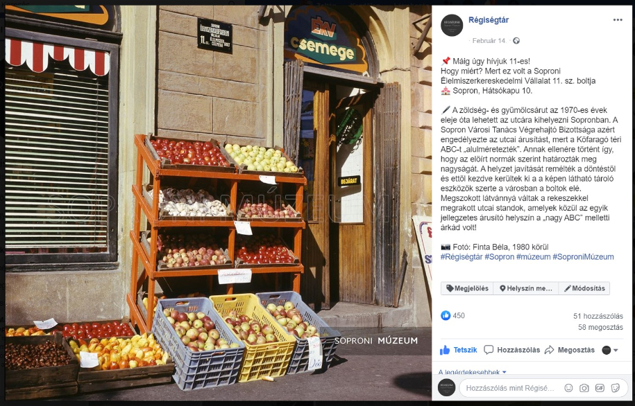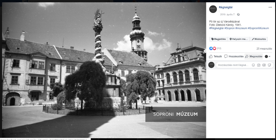 „Anyukám a bátyámmal kerek 40 éve 😊 köszönjük a képeket!” - „Apa❤” – „Lehet, hogy egyik az édesanyám!” - olvashatjuk a posztokban a Régiségtár facebook oldalán. A Soproni Múzeum legnépszerűbb facebook oldala 2 éve indult és követőinek száma mára meghaladja a 16 ezret. A Régiségtár projekt sokkal több, mint egy közösségi oldal. Kapcsolódik hozzá egy weboldal (www.regisegtar.hu), a műtárgyvédelmet és a kutatást szolgáló digitalizálási törekvés, miközben a látványos népszerűsítő tevékenységét sem szabad alulértékelni. A siker mögött megfeszített napi munka van, melynek jelentős része még a Soproni Múzeum fotó-adattárosa és önkéntes kollégája előtt áll, és még hosszú ideig munkával látja el őket.