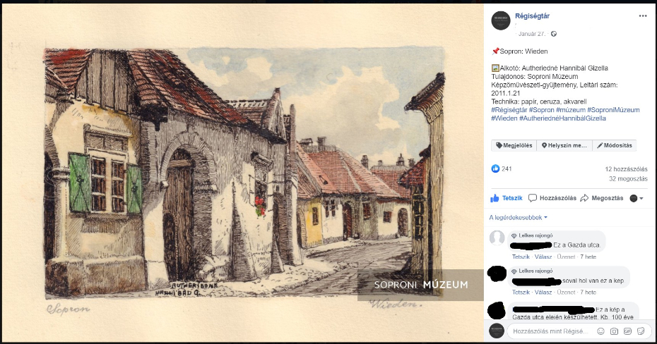 Egy online közösségben vajon mi adja azt az erős kohéziót, ami képes többezer embert összekötni? Ne legyünk szemérmesek! Nem mindig a színvonal, a kifinomultság és a műélvezet legmagasabb foka. A szerkesztők sem ennek hódolnak nap mint nap. A Régiségtár oldal naponta két alkalommal oszt meg a múzeum gyűjteményéből archív fotót, műtárgyról készített felvételt, fényképet, régi számlát, plakátot, festményt, vagy régészeti leletet. Gyakran egy elmosódott vagy kiégett fotó, ami célba ér. Hiszen, ki ne örülne, ha meglátja szülőházát, otthonát, ahol gyermekkorát töltötte vagy a falut, várost, amelyet jól ismer és szeret. A szomszéd utcában álló templomról készült olajfestmény is nagyon népszerű tud lenni, nem mellesleg a festészet iránt is felkeltheti az érdeklődést. Az oldal követőinek egy része különleges elkötelezettséget érez, hogy megfejtsen egy helyszínt, ahol a fotó készülhetett, vagy meghatározzon egy személyt, aki a képen látható. A Régiségtár tapasztalata szerint a legfontosabb, ami élővé teszi az oldalt, hogy rendszeresen, naponta osztanak meg képeket. Hiszen, ha nincs folyamatos tartalom, akkor nincs miért követni az oldalt. Mindezt úgy teszik, hogy minden poszttal megpróbálnak ismeretet közvetíteni és a régi fotók, valamint a műtárgyfelvételek arányát úgy kialakítani, hogy megmaradjon az érdeklődés, de azért egy látszólag érdektelen vázára vagy egy számlára is rákattintsanak az olvasól, hogy arról többet megtudjanak.