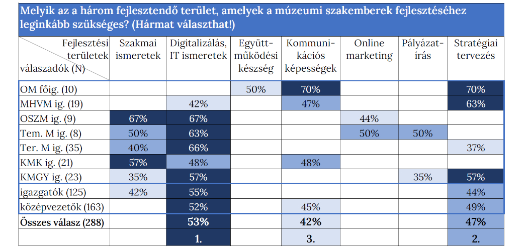 A stratégiai szemléletmód fontosságát a kutatás során eltérő súllyal határozták meg az igazgatók (125 válasz), középvezetők (163 válasz) online kérdőívünkre küldött 288 válaszukban a múzeumok fejlesztendő területeire vonatkozóan.