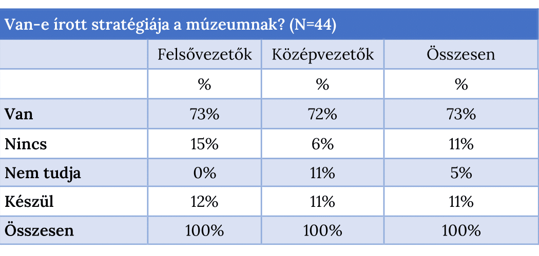 Arra a kérdésre, hogy van-e a múzeumnak stratégiája,az összes válaszadó 73%-a felelt igennel, 11%-uknál éppen készült. A válaszadók 5%-a nem tudta, hogy van-e múzeumának stratégiája és 11% jelezte, hogy nincs az intézménynek ilyen dokumentuma. [4]