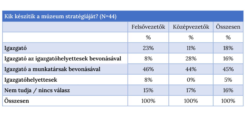 A stratégia elkészítése intézményenként eltérő módon történik: néhány igazgató egyedül készíti el a dokumentumot, ilyenkor jellemzően a pályázatát tekintik múzeumi stratégiának. Más igazgatók az igazgatóhelyettesekkel közösen készítik. Nagyrészt azonban (köztük az összes éppen készülő stratégia esetében) nagyobb körben, az osztályvezetőkön keresztül akár a teljes munkatársi kör bevonásával, elképzeléseik és véleményük meghallgatásával készítik el az alapdokumentumot. „(…) alapvetően egy stratégia szerintem egyik oldalról team munka, a másik oldalról viszont a végleges formájában a vezetésnek, az igazgatóságnak kell, hogy legyen a terméke.” Két válaszadó jelezte, hogy a stratégiát az igazgatóhelyettesek készítik önállóan.