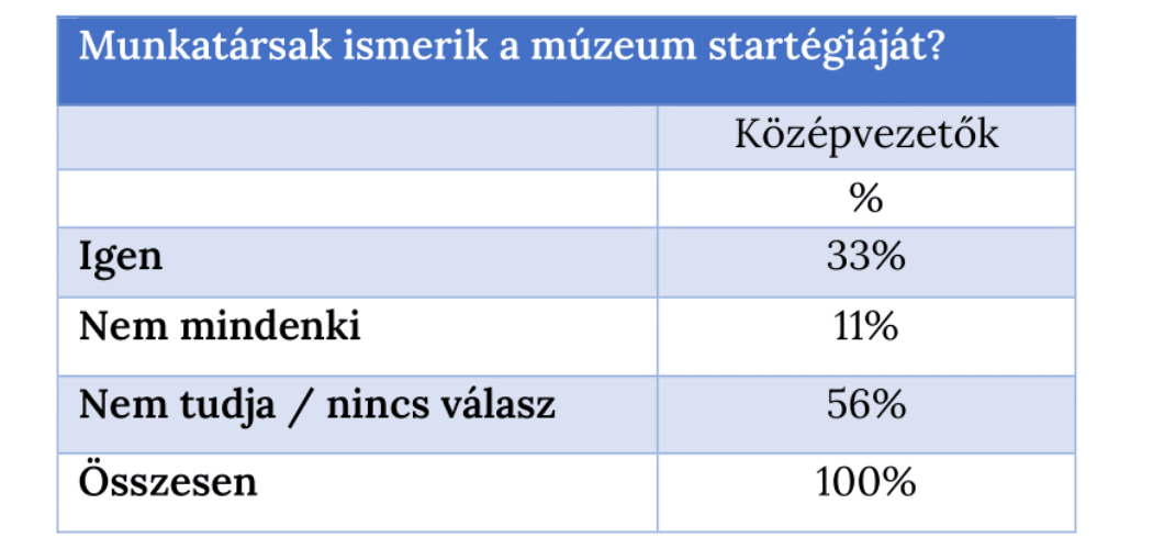 A középvezetőknek feltett kérdésre, miszerint a munkatársak ismerik-e a múzeum stratégiáját, igen tanulságos eredményt kaptunk. A válaszok alapján a vizsgált múzeumok mintegy harmadában vannak a munkatársak többé-kevésbé tisztában az intézményük stratégiával! Ráadásul még ott sem feltétlenül, ahol egyébként a munkatársakat bevonták a stratégiaalkotás folyamatába.