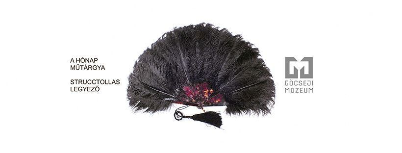 Az idei év februári műtárgyának bemutatását sikerült újra összehangolni. Ez a hónap a báli szezon időszaka, így számba vettük, mik azok a tárgyak, amik az ünnepi estek elengedhetetlen kellékei voltak. Így esett a választásunk egy a 19. század végéről származó nagyon mutatós strucctollas legyezőre. Régi idők mesés világába kalauzol el minket a műtárgy, még akkor is, ha a tollai enyhén hiányosak. Pompázatos látványa feledteti velünk ezt a kis hibát. A fekete strucctollas legyezőnek sötétbarna márványos mintázatú celluloid küllők adják a vázát, amiket sötétbarna vékony szalaggal fontak össze. A végén két kis fém szegeccsel felerősített mozgatható fül látható, erre kötötték a fekete fonalból sodrott szárat a három szálból fonott karikával, és a selyemfonalból készített bojttal. Gondos őrzése azért is fontos, mert restaurálása rendkívül összetett és nagy szakmai tudást, nem utolsósorban rengeteg időt igényel. Éppen ezért nagyon fontos a tárolás mikéntje a múzeumi gyűjteményben, hogy generációk sora meg tudja még csodálni ezt a páratlan alkotást.