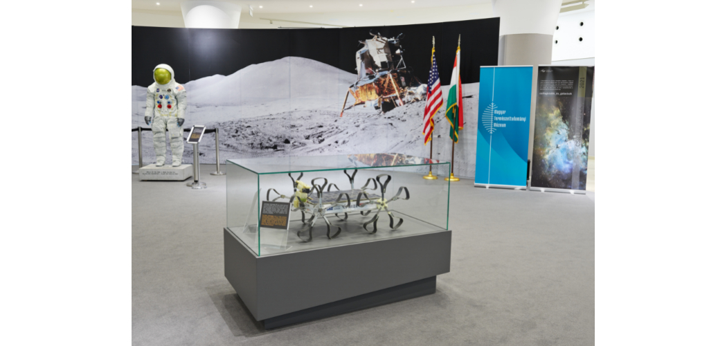 A NASA kiállítási tárgyaitól jobbra helyezkednek el a Puli Space Technologies Kft. által kölcsönzött tárgyak, a „Puli Rover” valamint a NASA-díjnyertes holdi vízszimatoló szerkezet makettje és a „Téridő Plakett”.