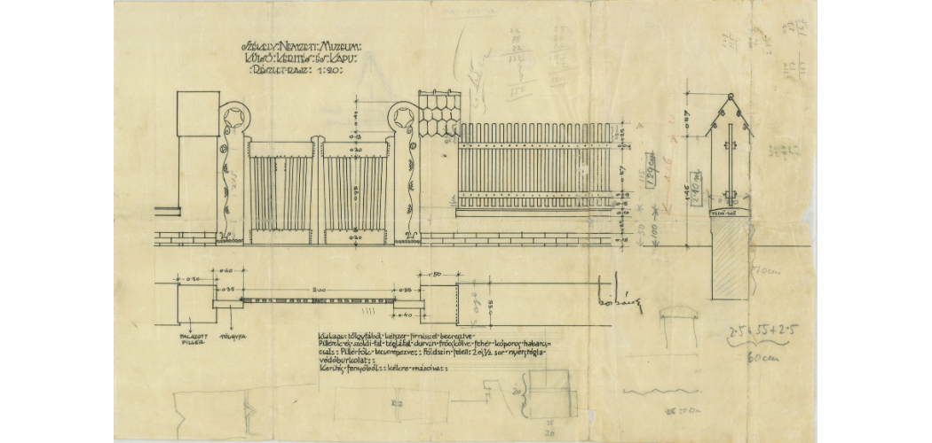 Kós Károly eredeti tervrajza. Külső kerítés és kapu részletrajz, metszettel. 1912; forrás: kos.bparchiv.hu