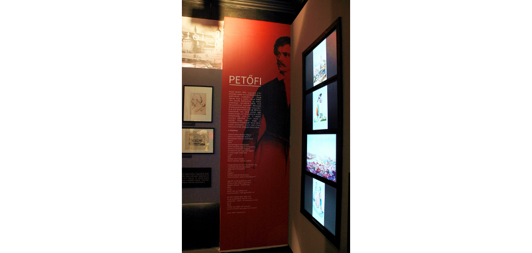 A bejáratnál rögtön a jól ismert Petőfi-dagerrotípia – amit barátja, Egressy Gábor, a kor kiemelkedő színésze készített – köszönti a látogatókat. Négy termen keresztül követhetjük végig a 19.század színjátszásának különféle aspektusait. Az első és harmadik információdús, hagyományos módszerekkel nyújt betekintést, míg a második és negyedik gyakorlati részvételre is ösztönöz – ez dinamizmust kölcsönöz, nem engedi a figyelmet lankadni. A költő vonalát kiemelve minden helyiségben a szürke és fekete színvilágot kiegészítő piros sávban olvashatók a hozzá kapcsolódó szempontok, a témával összefüggésben álló versei.