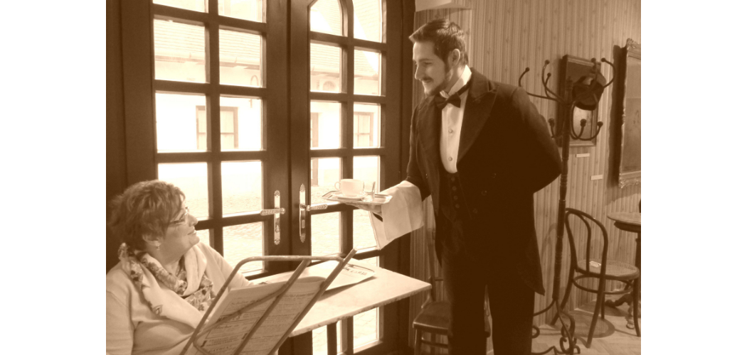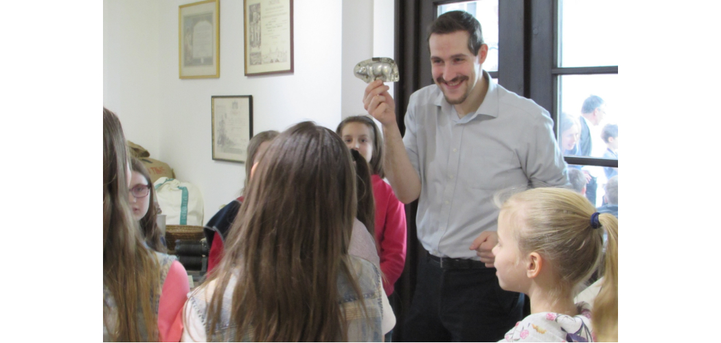 Interaktív tárlatvezetés a vendéglátás történeti kiállításon (épp szilveszteri csokimalac formát ad körbe Ádám)