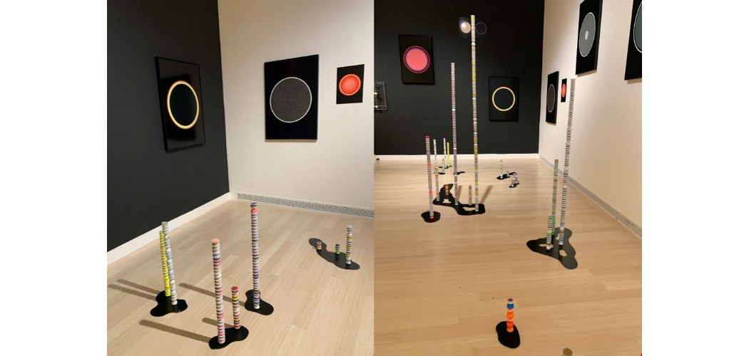 Ezután sem marad a látogató égbe törő formák nélkül, hiszen Kristóf Gábor építészeti oszlopai, golflabda installációi tornyokként törnek a terem mennyezete felé. A labda oszlopok ritmusa a falon elhelyezett hang alapú szerkezettel együtt egy gépiesített világot szimbolizálnak, de ezek az organikus formák mégis játékosközeget öltenek.