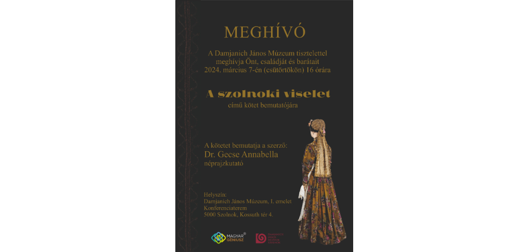 2024. március 7-én kerül megrendezésre Gecse Annabella A szolnoki viselet – A szolnoki viselet helye a szolnokiak öltözködésében és a Damjanich János Múzeum Néprajzi Gyűjteményében című kötetének bemutatója, amely egyben a 3. a múzeum tárgykatalógusainak sorában.