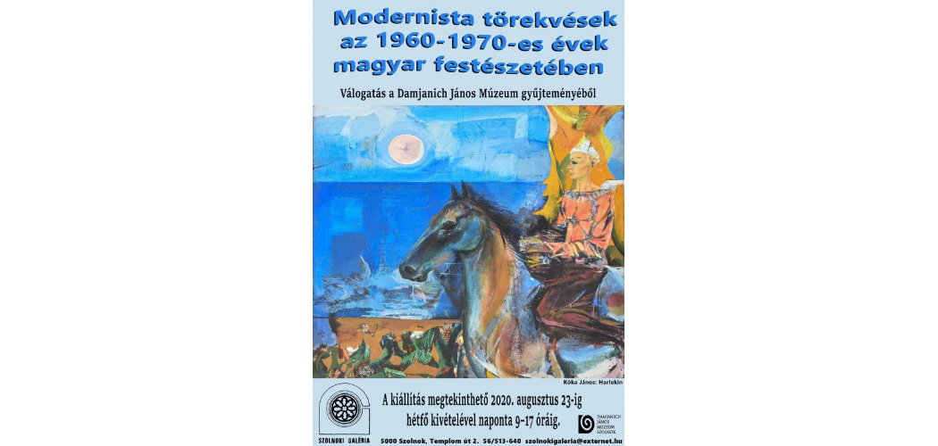 A járványügyi helyzet miatt kialakult átmeneti zárva tartást követően több hónap után a Szolnoki Galéria ismét megnyitotta kapuját az érdeklődők előtt. A Damjanich János Múzeum Művészettörténeti osztályának munkatársai a zárva tartás ideje alatt állították össze a Modernista törekvések, az 1960-70-es évek magyar festészetében című tárlat anyagát. A múzeum raktárából válogatott kiállítás a korszak festészetének, ma már szimbolikusnak számító magyar művészek festményeit mutatja be. A kiállított művek a múzeum gyűjteményének XX. századi gyűjteményéből lettek válogatva, amelyet a nem Szolnokon alkotó festők munkáiból hoztak létre az elmúlt évtizedek alatt. Számos képet a múzeumba kerülése óta korábban nem láthatott még a nagyközönség.