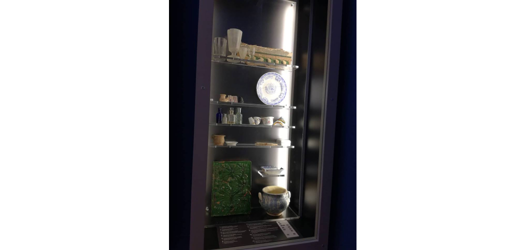 Ezt egészíti ki a keleti szárny kisebbik termében látható régészeti kiállítás, amely az épülethez kapcsolódó leleteket mutatja be. Az egészen korai, 14-15. századi fekete kerámiakancsó vagy egy 17-18. század virágosra festett deszka mellett 19. századi mindennapi használati tárgyakra is felfigyelhetünk, érzékelve, miként változott a tárgykultúra a ház félévezredes története során. Külön érdekesség az az 1890-es évekből származó bécsi fogtisztító por-tégely és csontból készült fogkefenyél, amely az egykori illemhelyről került elő az illatszeres üvegcsék, éjjeli edények, poharak, tányérok társaságában.