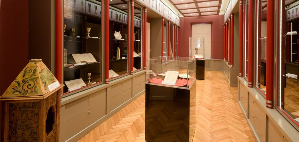 A kifinomult módon helyreállított terekből természetesen egy egyháztörténeti kiállítás se hiányozhat. Válogatást találhatunk itt az unitárius festménygyűjteményéből, kincsekből, többek között Dávid Ferenc kelyhével, 1500-as években nyomtatott prédikációival, arany és ezüst szállal hímzett úrasztali terítőkkel vagy épp egy díszes török imaszőnyeggel.