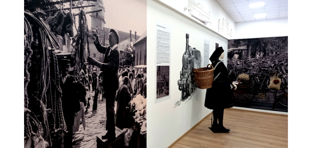A következő szakasz az 1945-től napjainkig terjedő időszakot dolgozza fel, ahol az 1960-70-es évek bicikliktől zsúfolt belvárosi piacának hangulatát elevenítik fel a rendezők fotónagyítással és egy kosarakkal megpakolt bicikli segítségével. A közelében egy hagyományos viseletbe öltözött ceglédberceli sváb asszony hátikosárral igyekszik a zöldségpiacra. Az Eötvös téri piac forgatagának látképe előtt pedig egy asszony áll az 1970-es évek viseletében és a helyi boltok csomagjaival.