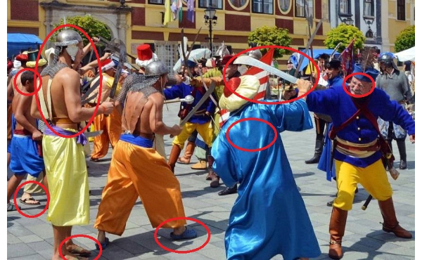 - sok a fényes, műanyag érzetű holmijuk vagy van rajtuk szemmel láthatóan nem történelmi viselet (sportcipő, gumicsizma, szemüveg)