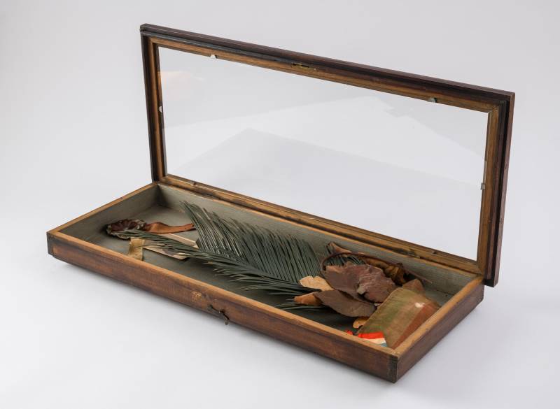 Barna üvegezett fatokban (fent barokkos rátéttel) a főhelyet Kossuth ravataláról való nagy babérág foglalja el, felette kokárda (színehagyott), a babérág felső végei közt nyomat Kossuth öregkori arcképével, alsó végénél hervadt levelek a sírról származó koszorúkról, legalul kopott nemzeti színű sáv és kék-sárga-piros kokárda.
