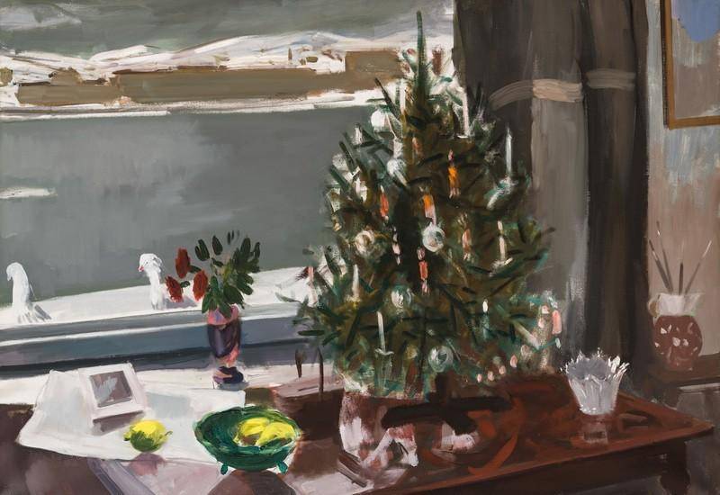 Idei utolsó képgalériánkba karácsonyi különlegességeket gyűjtöttünk össze. A teljes galéria a MuseuMap-en a szöveg végén található link segítségével érhető el. https://www.museumap.hu/gallery/-/description/userCollection/394390/522066 Az ablaknál álló asztalon nem szokványos csendélet látható. A kép fő motívuma egy feldíszített karácsonyfa. A fenyő és a téli tájkép találkoztatása egy ablak közvetítésével Bernáth Aurél festői ötleteinek tipikus példája. A műtermi ablak kilátást enged a téli Dunára, a túlsó partra, a szürke folyóra és az ablaknál melegedő galambokra. A belső tér színei sötétebbek, melegebbek. A kinti és benti világ kontrasztjában a fehér részletek fejezik ki a művész éles szemlélődését. Bernáth Aurél a benti világ védett nyugalmát hangsúlyozza. A tárgyakból az otthon hétköznapi rendje, az asztalon heverő fényképről a személyesség árad. Ennek az élettelen világnak kerekedik fölébe az örömhozó karácsonyfa a maga szertelenül tarka díszeivel. A karácsonyfa jobb oldalát a múlandóság érzetével nyeli magába a szoba sötétje. (Horváth János)